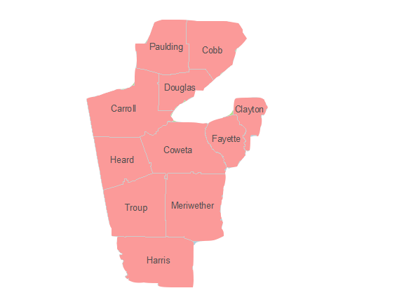 Carroll, Clayton, Cobb, Coweta, Douglas, Fayette, Harris, Heard, Meriwether, Paulding, Troup